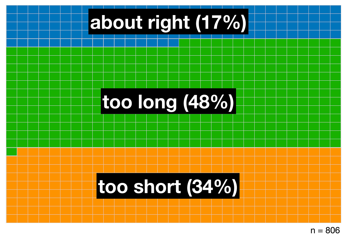 And second, we only get to see one half of each conversation, so we don’t know how accurate participants were when they guessed their partners’ desires, nor do we know how people were paired up. Maybe, for instance, the “too long”s and the “too short”s were all paired with each other, and that’s why no one got what they wanted—they wanted different things.