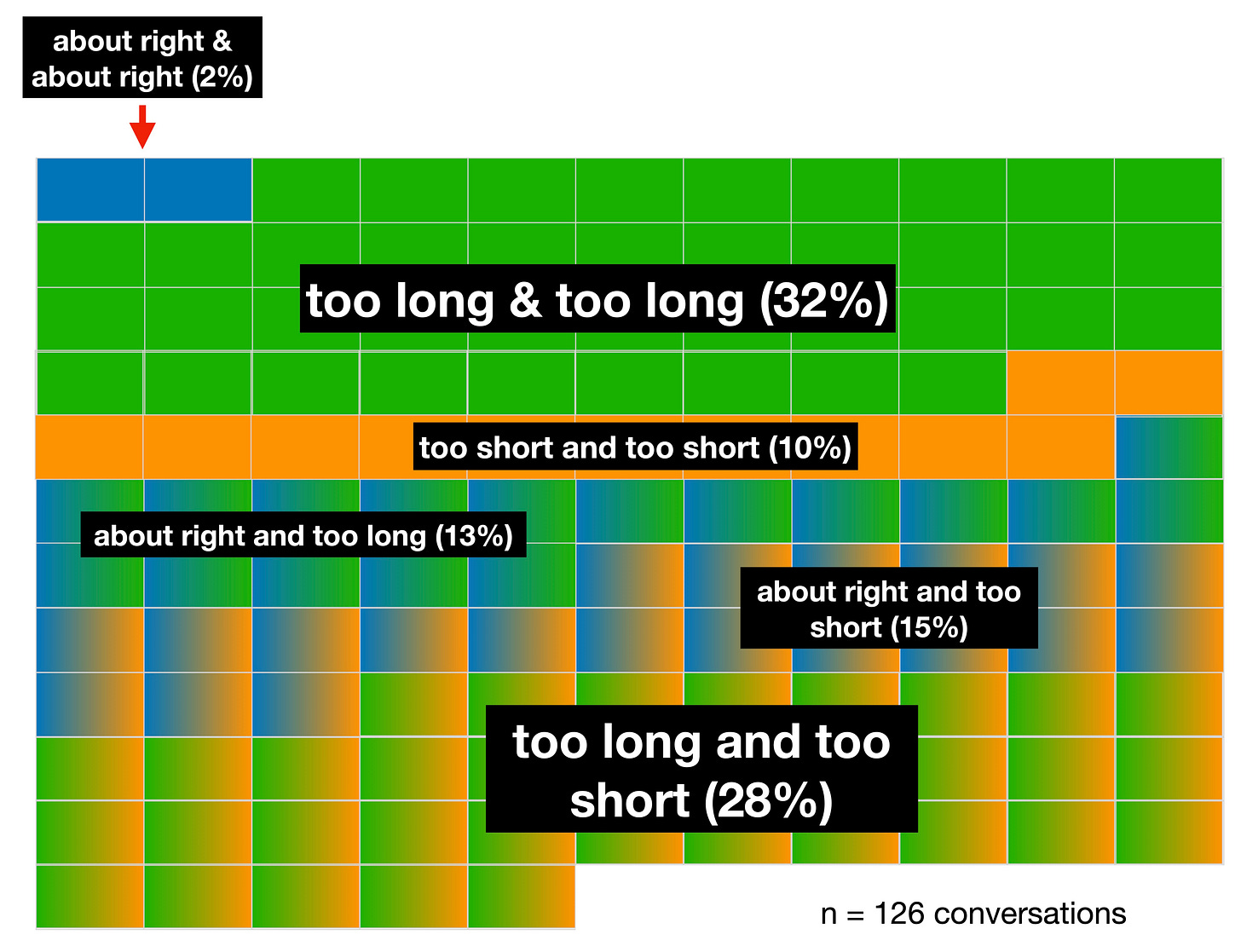 But now we have both sides of the conversation, so we can also see how people were paired. Was every “too short” partnered with a “too long”? Nope. In fact, almost half the time, both participants said “too long” or both said “too short”. Only 30% of conversations ended when even one person wanted it to end.