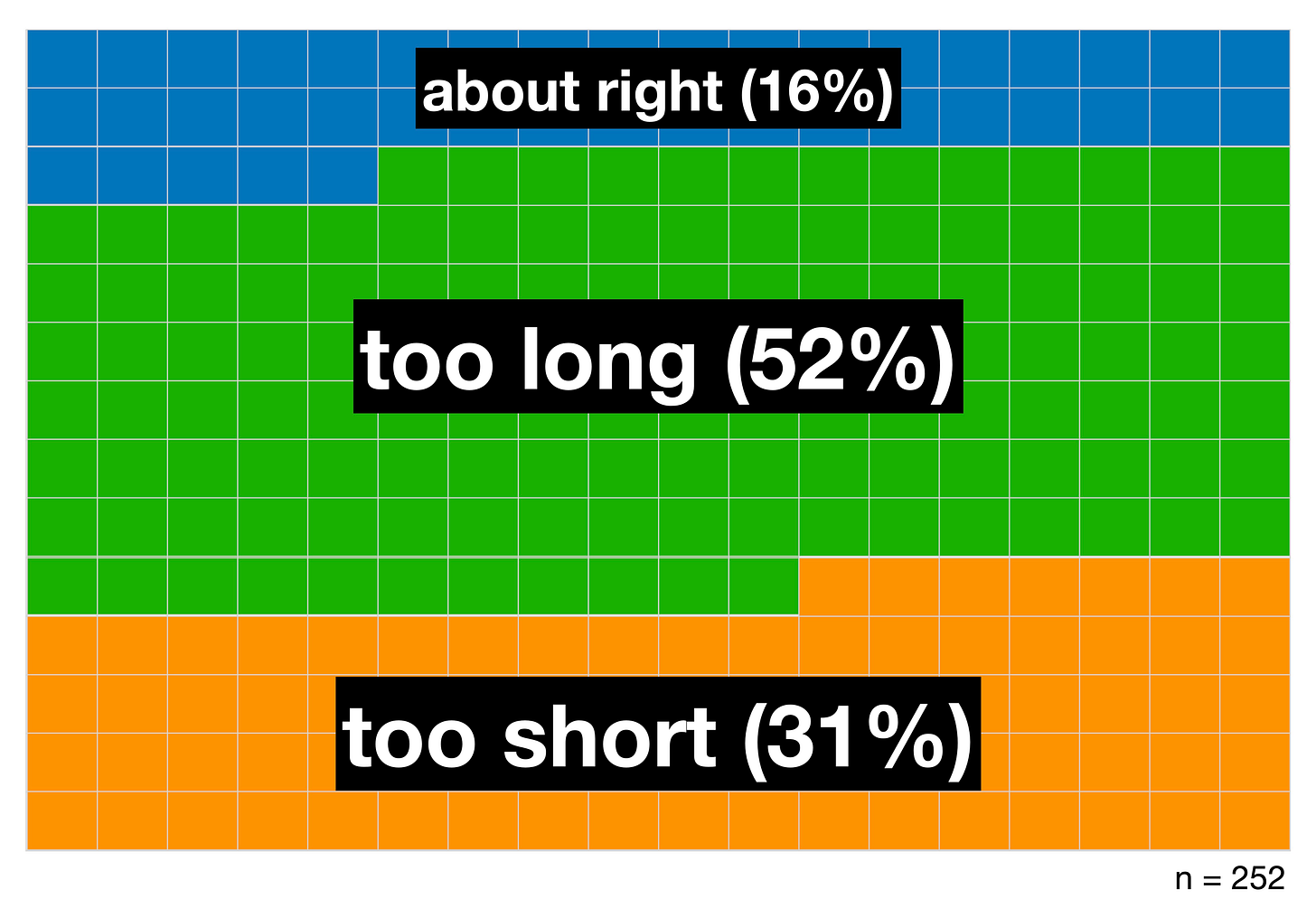One thing that surprised us, anyway, was that the people who said “too short” were just as happy as the people who said “just right”. (They were both happier than the people who said “too long”.) You might think that getting cut off would leave you feeling blue, but it’s actually kind of delicious to be left wanting more. So better to err on the side of leaving sooner—you can usually have more, but you can never have less.