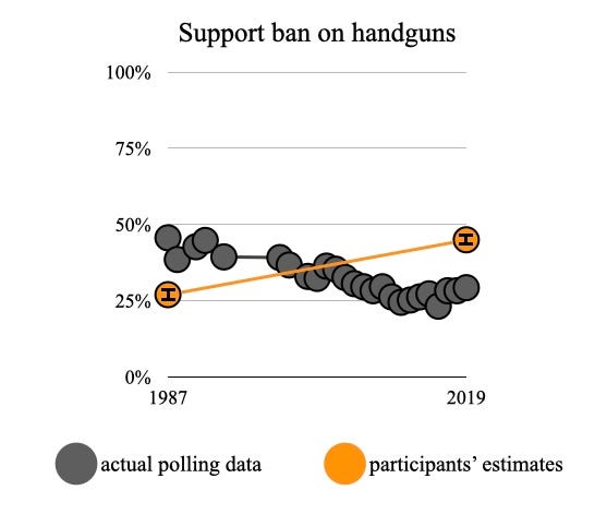 In 2022, my colleague Jason Dana and I published a paper showing that people don’t know how public opinion has changed. Like this:
