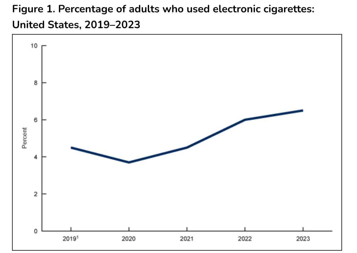 In case you’re wondering, the decline in smoking has not been offset by an increase in vaping. While adults vape a tiny bit more today than they did in 2019, the difference is very small: