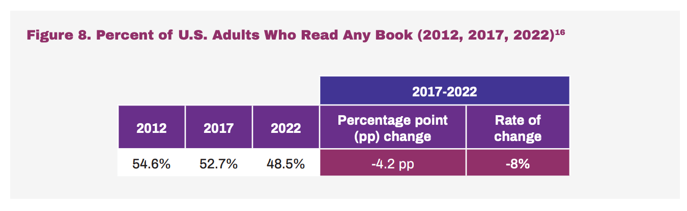 Other surveys document similarly moderate declines. For instance, data from the National Endowment for the Arts finds a slight decrease in reading over the past decade: