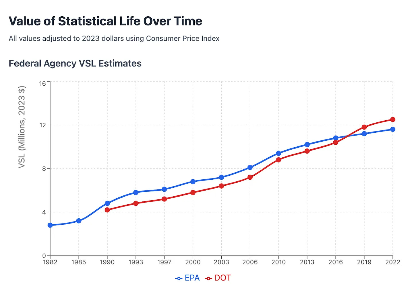When federal agencies do cost-benefit analyses, they have to figure out how much a human life is worth. (Otherwise, how do you know if it’s worth building, say, a new interstate that will help millions get to work on time but might cause some excess deaths due to air pollution?) They do this by asking people how much they would be willing to pay to reduce their risk of dying, which they then use to calculate the “value of a statistical life”. According to an analysis by the Substacker