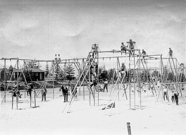 My life is nothing like theirs was. Nobody has ever asked me to shoot anybody. I’ve got a big-screen TV. I could get sushi delivered to my house in 30 minutes. The Social Security Administration thinks I might make it to 80. Why would I risk all this? The things my grandparents did casually—smoking, hitching a ride in the back of a pickup truck, postponing medical treatment until absolutely necessary—all of those feel unthinkable to me now.12 I have a miniature heart attack just looking at the kinds of playgrounds they had back then:
