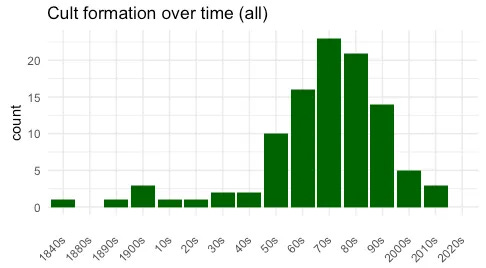 analyzed cults that have been covered on a popular and long-running podcast and found that most of them started in the 60s, 70s, and 80s, with a steep dropoff after 20002:Crimes and cults are definitely deviant, and they appear to be on the decline. That’s good. But here’s where things get surprising: neutral and positive forms of deviance also seem to be getting rarer. For example—