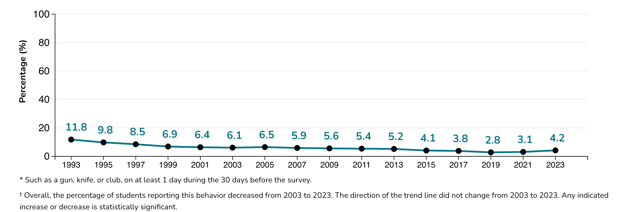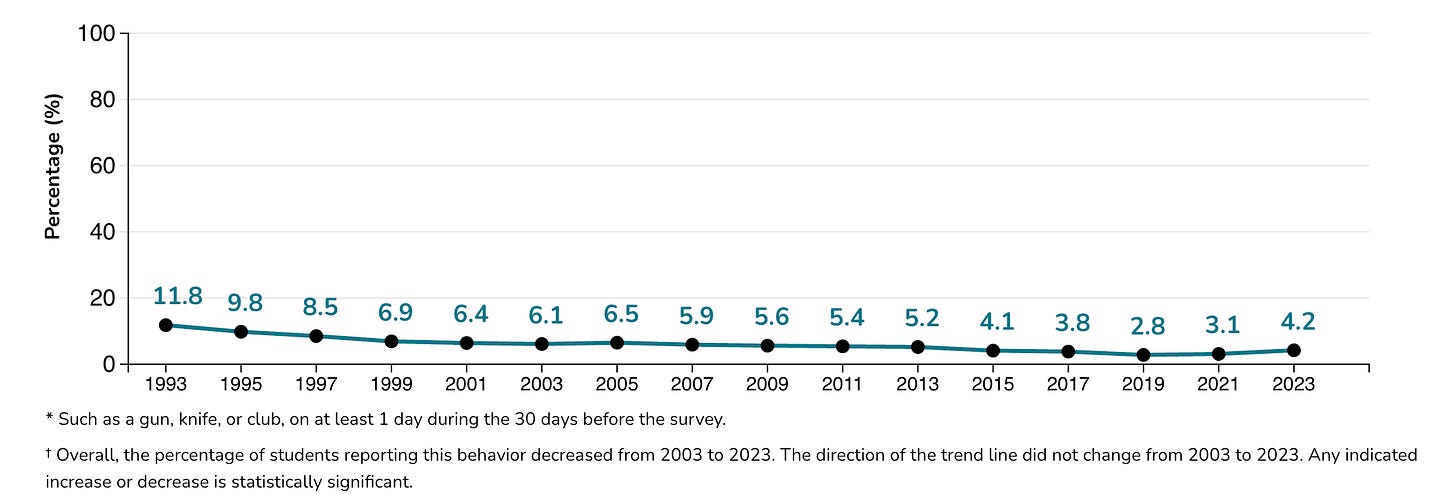 They’re also less likely to smoke, have sex, or get in a fight, less likely to abuse painkillers, and less likely to do meth, ecstasy, hallucinogens, inhalants, and heroin. (Don’t kids vape now instead of smoking? No: vaping also declined from 2015 to 2023.) Weed peaked in the late 90s, when almost 50% of high schoolers reported that they had toked up at least once. Now that number is down to 30%. Kids these days are even more likely to use their seatbelts.