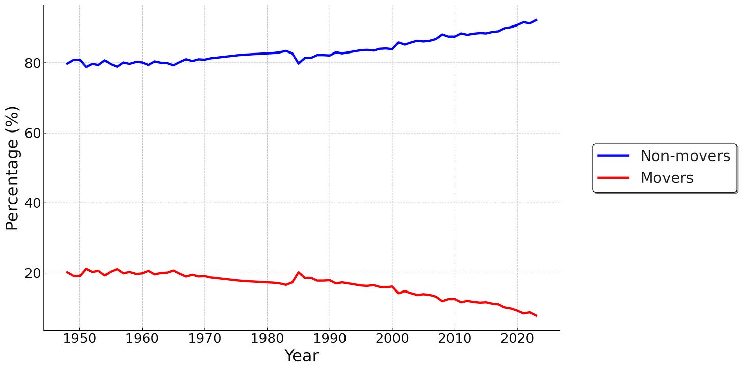 I was totally wrong about this. Americans have been getting less and less likely to move since the mid-1980s: