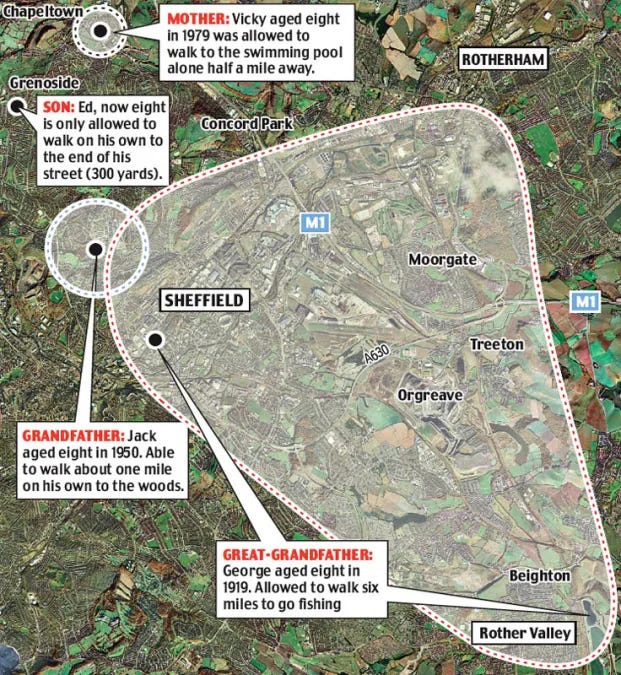 Perhaps that’s also why we’ve become so concerned about the safety of our children, when previous generations were much more laissez-faire. This map traces how the changes in a single family, but the pattern seems broadly true: