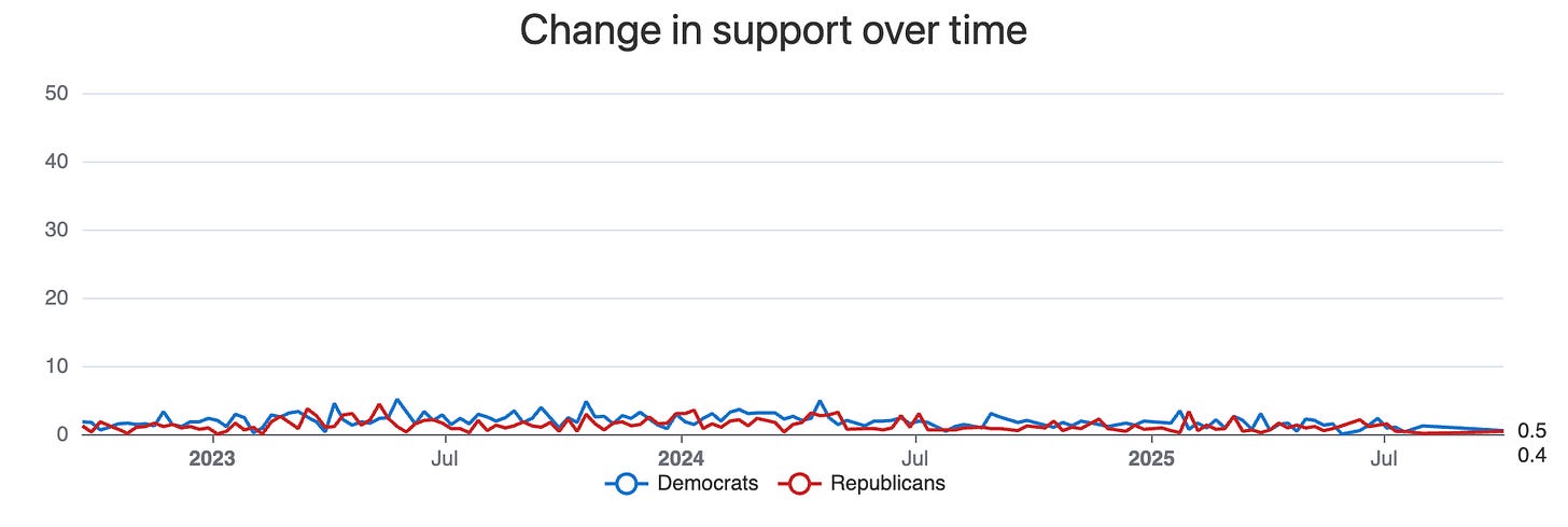 The Polarization Dashboard is a useful sanity check against current events. Whenever something big happens in politics, people are like “WOW OUR VERY SOULS HAVE PERMANENTLY CHANGED” when in fact people almost always have the same opinions that they did yesterday. Here’s the change in support for murdering members of the opposite political party over time. Currently, <2% of Democrats and Republicans support it. (h/t