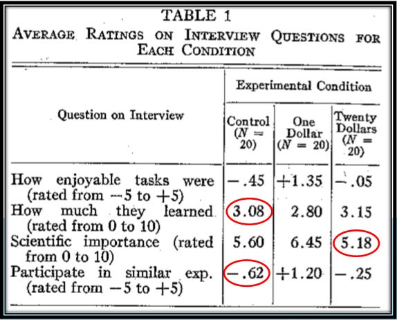One of the most famous psychology experiments of all time is Festinger and Carlsmith (1959), the classic demonstration of cognitive dissonance. The psychologist Matti Heino points out, though, that the main results literally don’t add up. In the table below, the circled means are impossible given the reported sample size—there’s no way to get an average of 3.08, for instance, if you have 20 people giving ratings on a 0-10 scale.