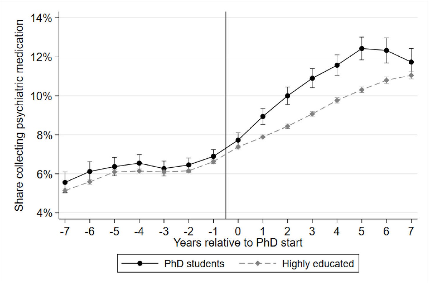 A new paper tracked all PhD students in Sweden and found that they’re more likely to take psychiatric medication compared to a matched group who stopped their education at the master’s level. This isn’t randomized and we should assume these two groups differ in lots of ways. But the fact that the differences grow over time and then disappear at year seven, when most people who started their PhDs have now finished them, does suggest that getting your doctorate is distressing.